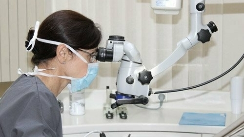 Le Docteur Valérie Travert utilise un microscope (ou loupe binoculaire) de haute technologie pour permettre de préciser les traitements en endodontie.